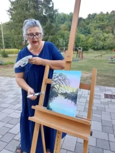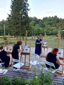 Još jedna radionica „Kist i čašica u prirodi“ održana je 28. kolovoza 2025. godine u Ekološkom centru „Vrata Zrinske gore“. Voditeljica Ivana Švragulja je polaznice radionice u predvečerje čarobne prirode na pragu Zrinske gore pretvorila u sjećanje na protekle vruće ljetne dane. Slikalo se na temu „Kupski san“. Ovaj put, potpuno neplanirano, čak je ručno oslikana i jedna haljina. Naime, malo slikarskog zanosa i nešto boje otišlo je i na odjeću. Voditeljica Ivana predložila je oslikati haljinu, a polaznica Marija, inače rodom iz Slavonije, a koja je svoje obiteljsko gnijezdo svila u Petrinji, s oduševljenjem je to prihvatila. Stoga, imajte na umu kako je kod nas uvijek itekako zabavno. Zahvaljujemo voditeljici radionice kao i polaznicama na stvaranju novih likovnih ljepota i prepoznavanju Centra i radionice kao odličnog načina za opuštanje od svakodnevice. Vidimo se na sljedećoj!